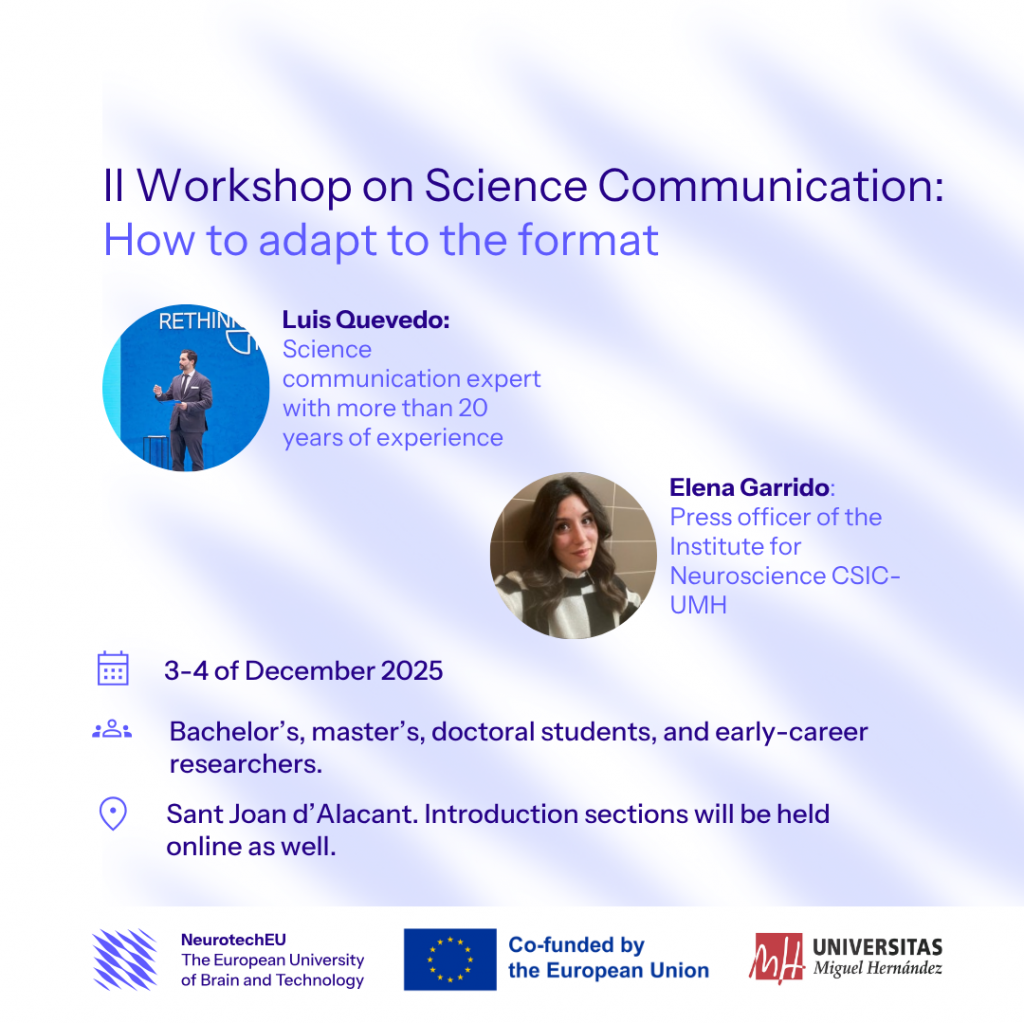 If you are a UMH student and are interested in participating, please apply for admission to the workshop via this link using an institutional email address. If you are not a UMH student and are interested in attending in person, please contact the NeurotechEU Project Office at your university.